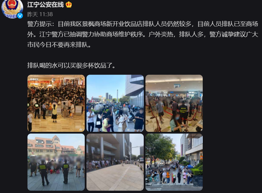 警方给出“官方提示”,由于“饮品店”排队人员较多,人员排队已至商场外,江宁警方已抽调警力协助商场维护秩序。