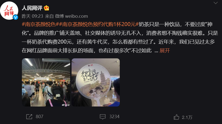 人民网发表评论,奶茶只是一种饮品,不要过度“神化”。