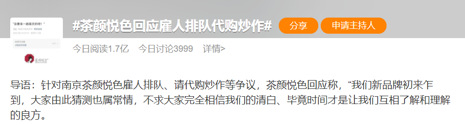 #南京茶颜悦色预约代购1杯200元#、#茶颜悦色回应雇人排队代购炒作#、#茶颜悦色就南京开业风波致歉#等话题连环出现在热搜榜上。