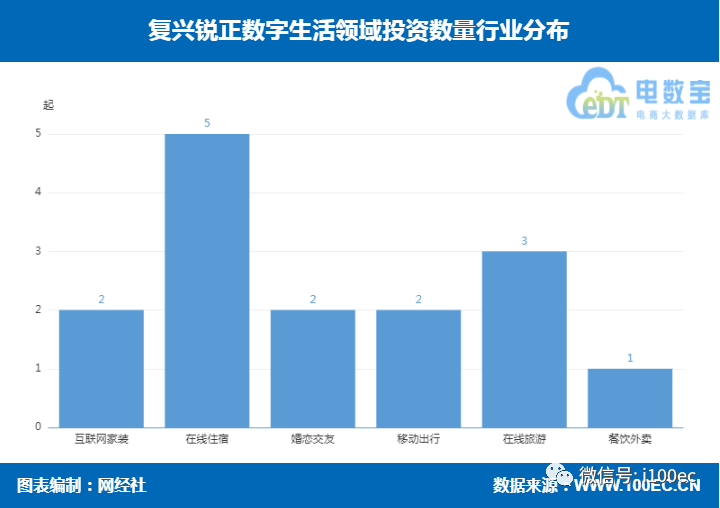 数字生活赛道上,君联资本最青睐在线住宿行业,投资数量为5起。此外,在线旅游投资数量为3起,互联网家装、婚恋交友、移动出行各位2起,餐饮外卖为1起。