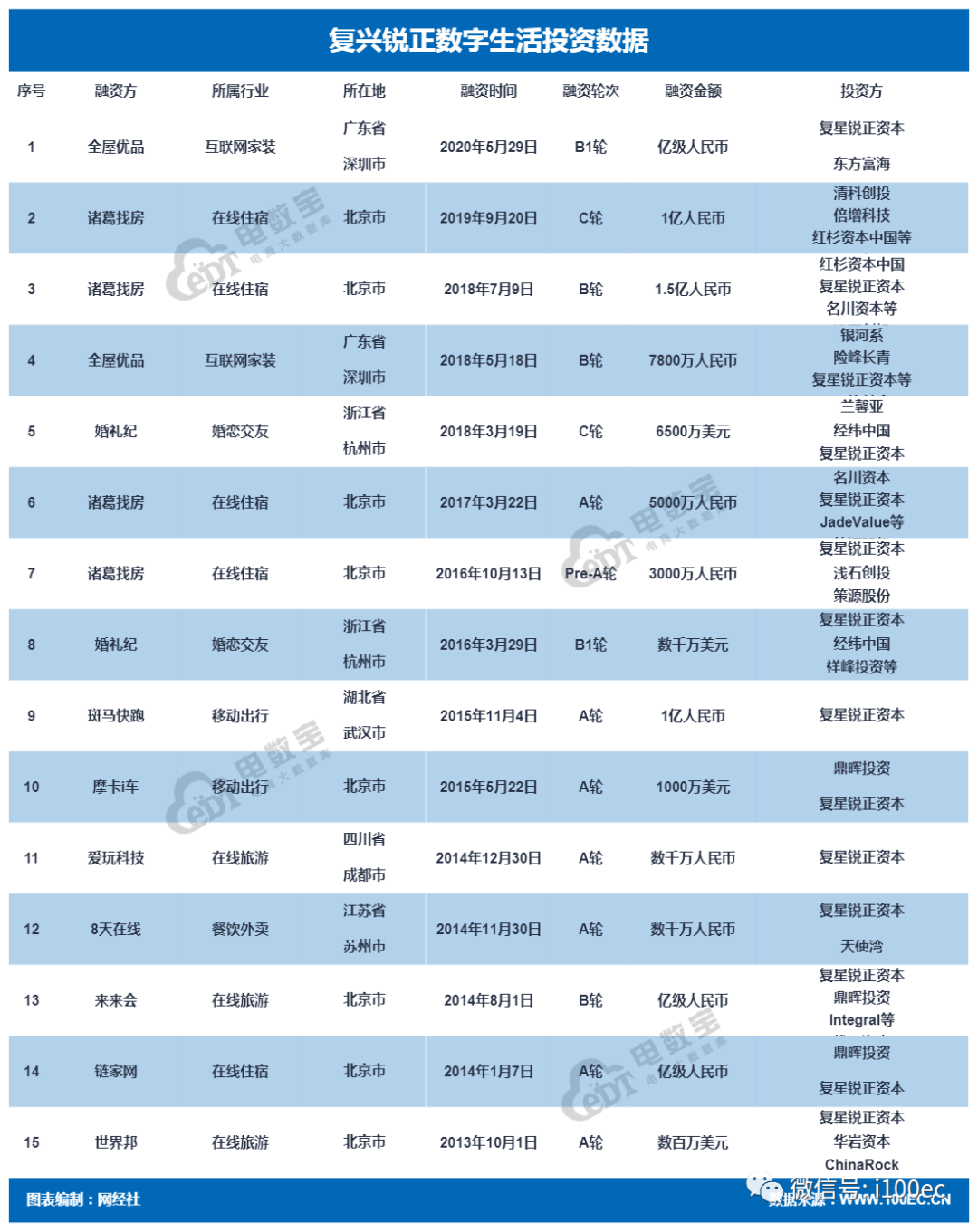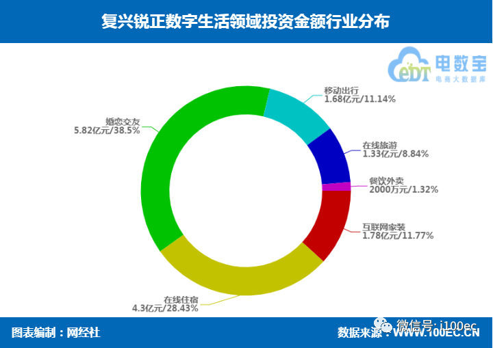 投资金额中,复兴锐正重点押注婚恋交友行业,涉及金额为5.82亿元;其次为在线住宿,为4.3亿元;互联网家装为1.78亿元;移动出行为1.68亿元;在线旅游为1.33亿元;餐饮外卖为2000万元。