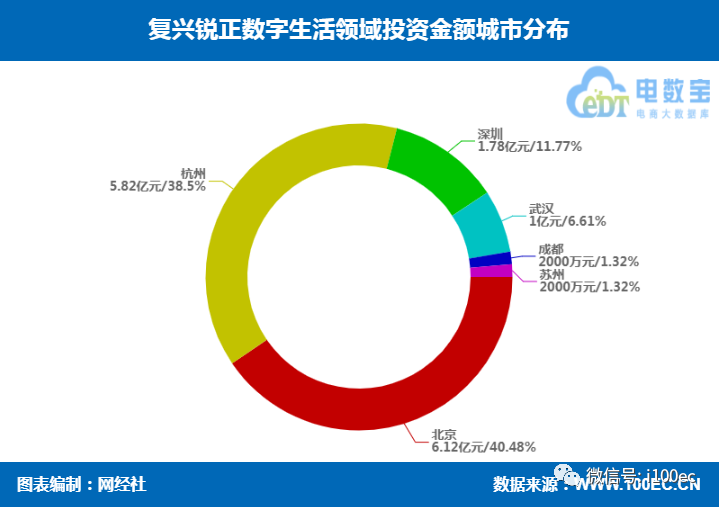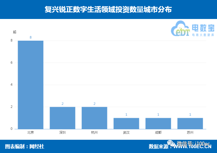 城市分布上,复兴锐正在北京投资次数最多,为8起。此外,深圳、杭州各2起,武汉、成都、苏州各1起投资。
