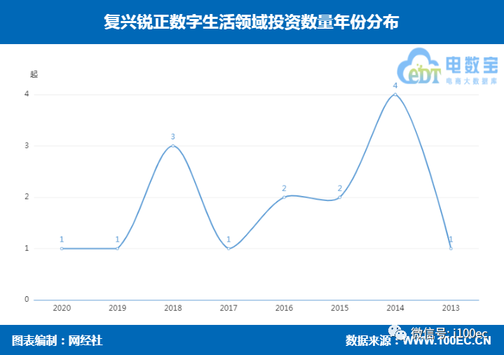 在年份分布上,复兴锐正2014年投资次数最多,为4起;此外,2013年1起、2015年2起、2016年2起、2017年1起、2018年3起、2019年1起、2020年1起。