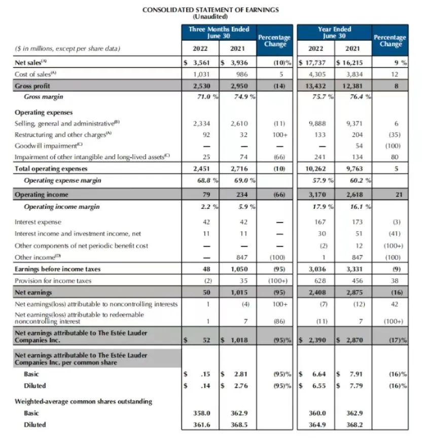 8月18日,雅诗兰黛集团公布2022财年全年业绩,截至2022年6月30日的财年总净销售额为177.4亿美元(约合人民币1203.85亿元),比上年同期的162.2亿美元(约合人民币1100.71亿元)增长9%;净利润为23.9亿美元(约合人民币162.18亿元),比上年同期的28.7亿美元(约合人民币194.76亿元)下滑16.73%。