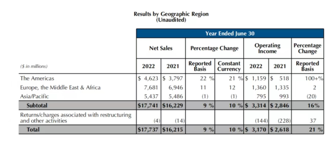 分区域整体来看,美洲和EMEA(欧洲、中东、非洲)地区净销售额均实现了两位数的增长,而亚太地区整体营收下滑1%。其中美洲地区增长22%至46.23亿美元(约合人民币314.76亿元),EMEA地区增长11%至76.81亿美元(约合人民币522.96亿元)。