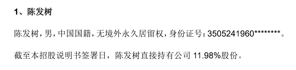资料显示,早在2015年6月,陈发树出自6740.8万元进行增资,其中440万元计入了注册资本,完成后当时陈发树持股比例8.64%。