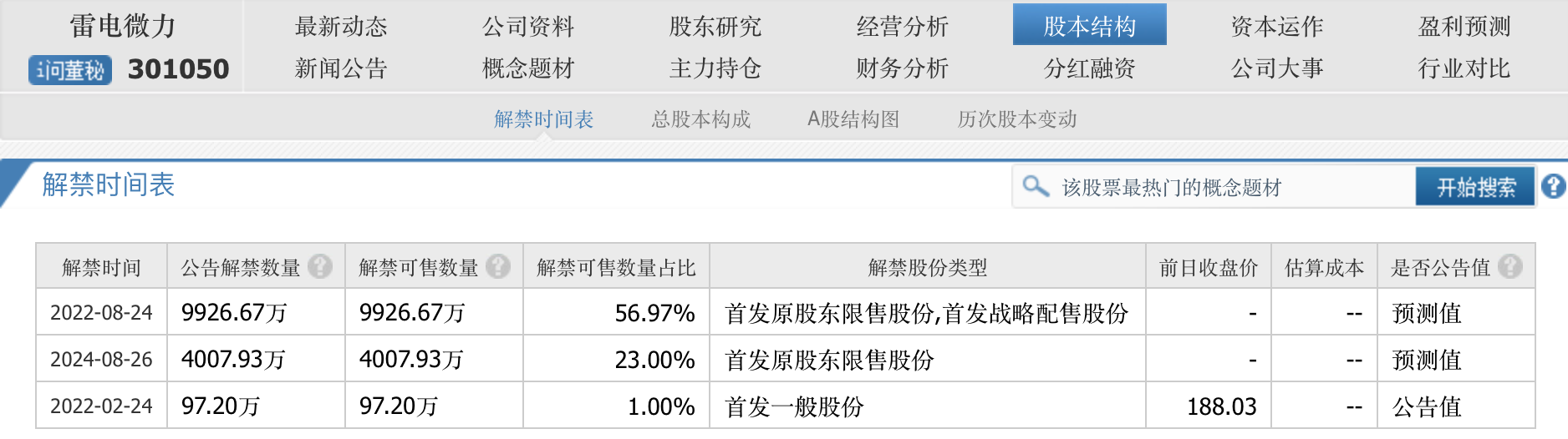 上市一年,8月24日,雷电微力(301050.SZ)即将迎来首发限售股解禁,其解禁市值接近约百亿,当周,该股解禁市值仅次于中国电信(601728.SH)。