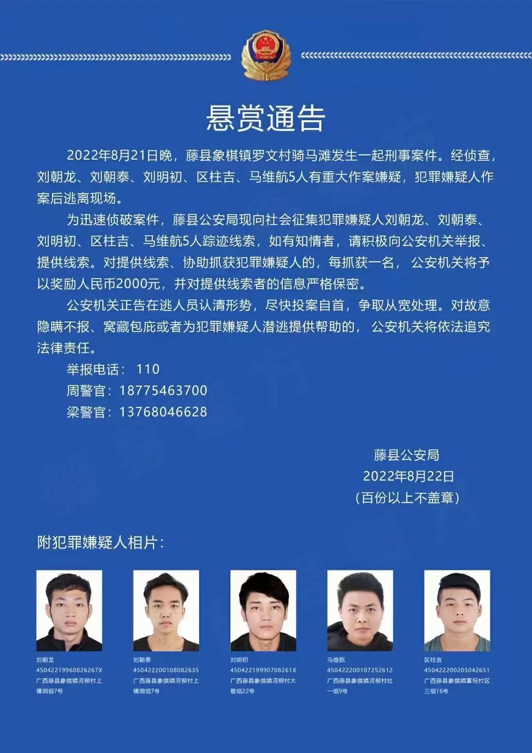 据“藤县融媒”微信公众号消息,藤县公安局发布悬赏通告,2022年8月21日晚,藤县象棋镇罗文村骑马滩发生一起刑事案件。经侦查,刘朝龙、刘朝泰、刘明初、区桂吉、马维航5人有重大作案嫌疑,犯罪嫌疑人作案后逃离现场。