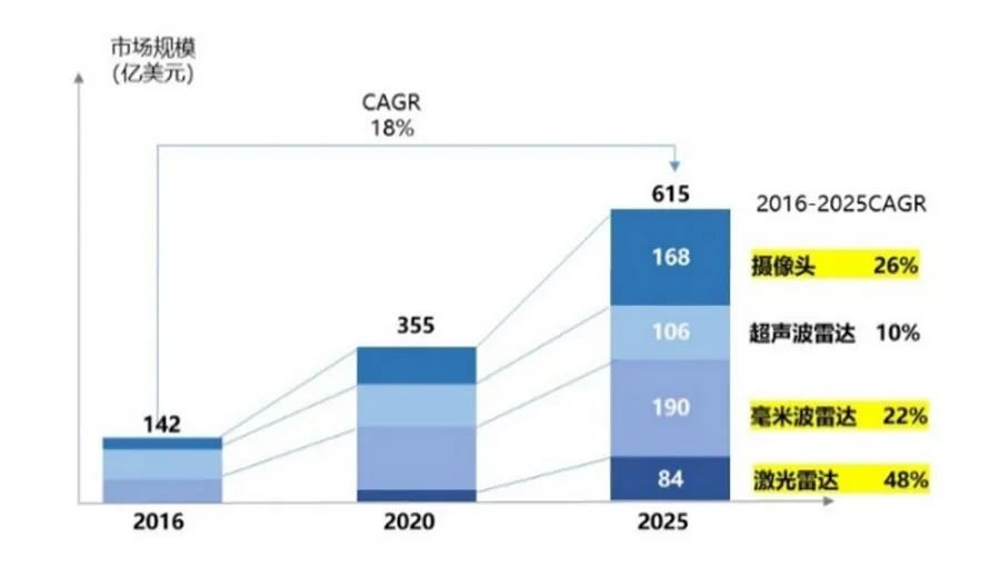 目前智能传感器细分中,超声波雷达的技术和应用已相对成熟,摄像头、毫米波雷达和激光雷达正蓬勃发展,迎来活跃的技术创新。预计2016-2025年,超声波雷达市场规模年复合增速仅为10%,摄像头、毫米波雷达和激光雷达市场规模年复合增速分别为26%、22%、48%。