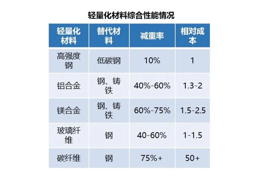 汽车轻量化成为当前解决节能减排问题的核心抓手,也是解决新能源汽车续航里程问题的一个重要选项,轻量化设计已成为汽车行业未来发展的一大方向。汽车轻量化涉及汽车内外饰、发动机、底盘、仪表盘、车身、车架、座椅等部件。目前汽车轻量化主要有三种途径,一是汽车材料的轻量化,二是结构的轻量化,三是制造工艺的轻量化,其中大多数车企在轻量化过程中以材料轻量化为主。