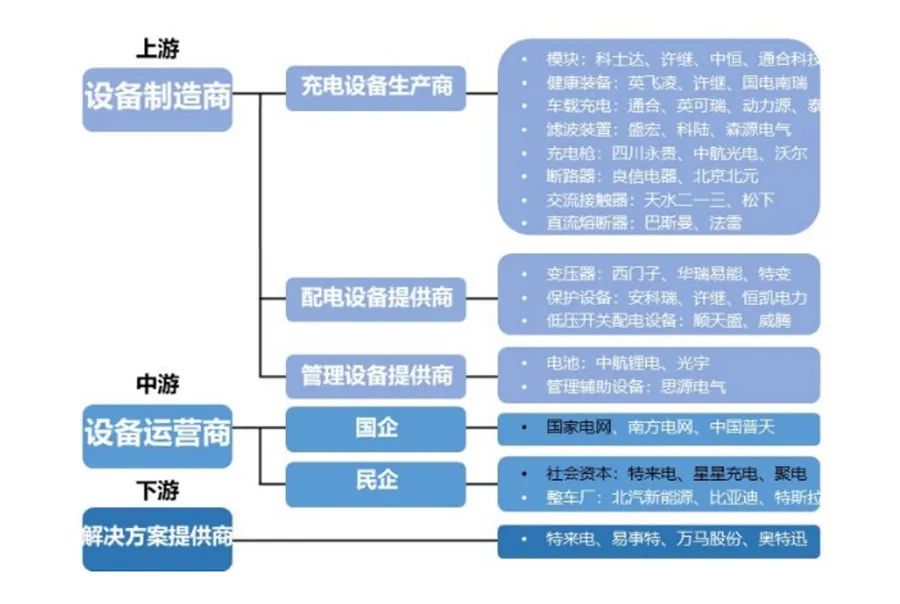 随着新能源车的进一步增长,加上中央及地方政府的规划与扶持,充电桩和换电站的市场前景看好。充电设备上中下游企业重合度高,上游制造商负责充电设备和配电设备制造,中游运营商负责充电桩、充电站的搭建和运营,下游解决方案商提供位置服务、付费和运营管理解决方案。