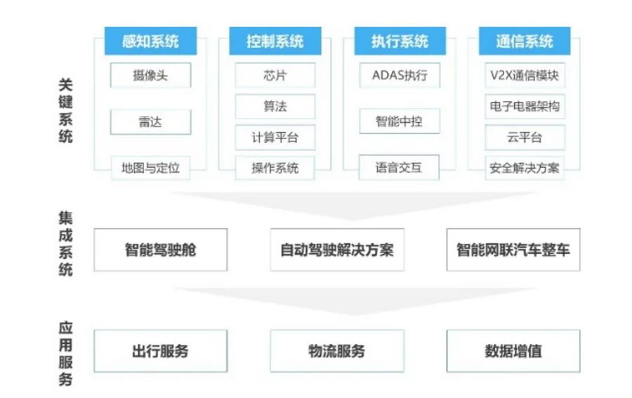 智能网联汽车产业链包含上游关键系统、中游系统集成以及下游的应用服务。其中上游涵盖了感知系统、控制系统、执行系统等关键系统;中游涵盖了智能驾驶舱、自动驾驶解决方案以及智能网联汽车等集成系统;下游涵盖了出行服务、物流服务等应用服务。
