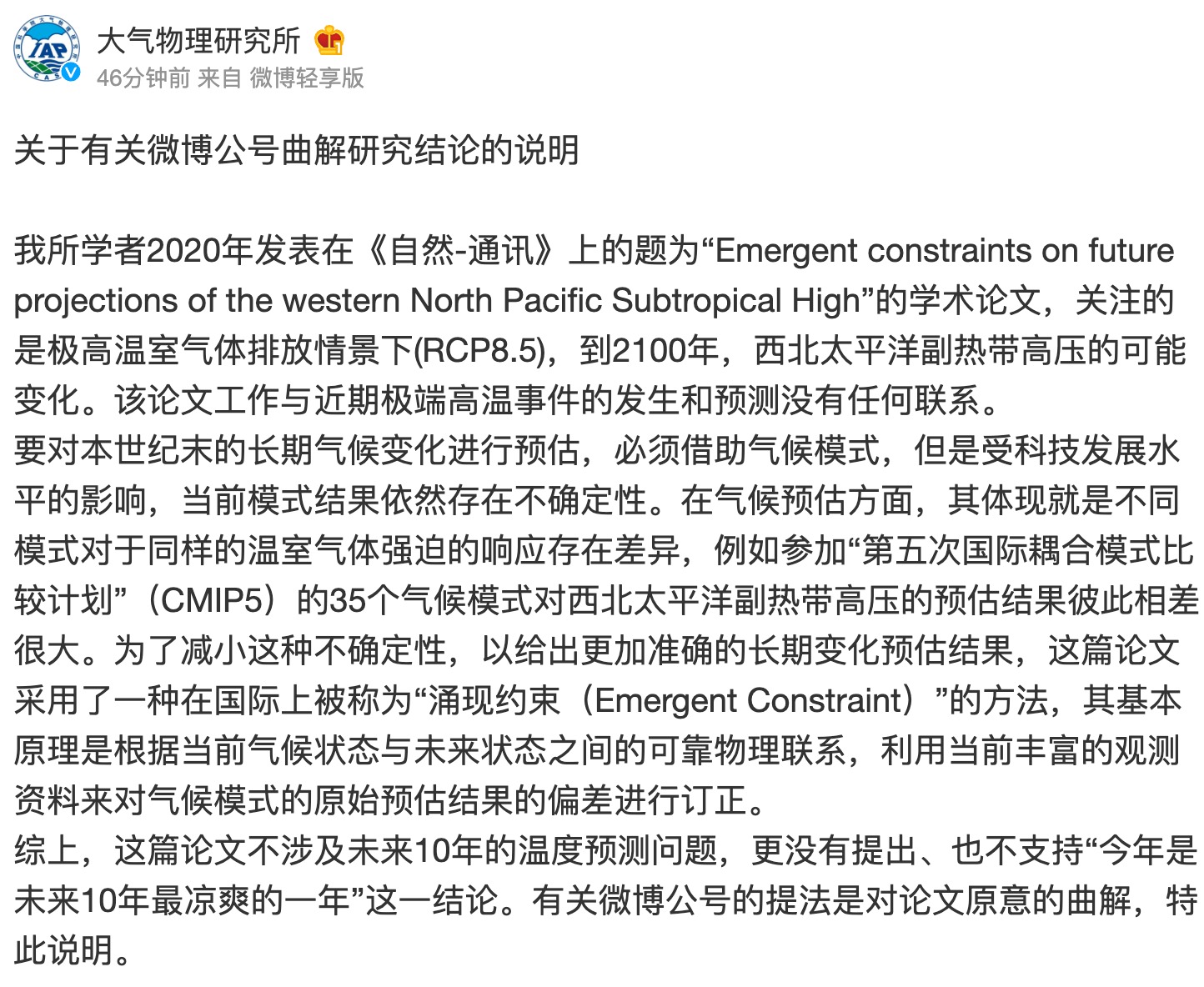 8月22日,中科院大气物理研究所在其官方微博发布关于有关微博公号曲解研究结论的说明称,该所学者2020年发表在《自然-通讯》上的题为“Emergent constraints on future projections of the western North Pacific Subtropical High”的学术论文,关注的是极高温室气体排放情景下(RCP8.5),到2100年,西北太平洋副热带高压的可能变化。该论文工作与近期极端高温事件的发生和预测没有任何联系。
