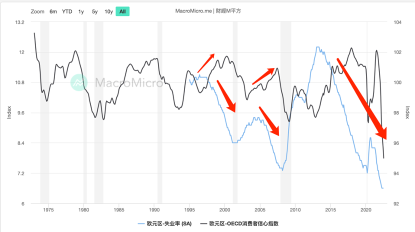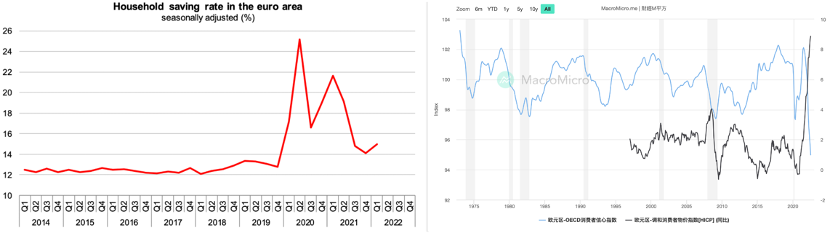 上图我们也大致验证了我们的判断,左图为欧元区的家庭储蓄率情况,在2021年末之后该数字开始明显回升,右图则看到了随着核心通胀上行,消费者信心的垮塌式下行,且两组数据的拐点也表现了惊人的一致性。