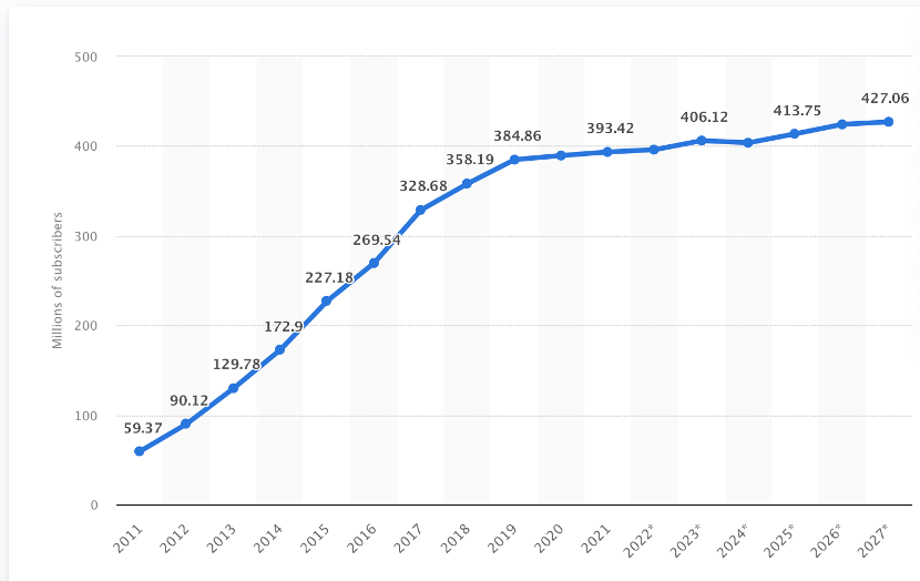 在经历将近十年高速增长之后,上图折线在2020年之后开始日趋变缓,呈现小幅上涨的局面,这一方面验证了中国手机厂商在2017年前后将此市场作为重点突破口时机之正确,另一方面让我们颇为不解的是,该地区智能手机注册用户仍在缓慢增长,以规律来看新入网手机与换机需求更迭,理论上该地区行业智能手机增长仍将有一定空间,理论上不应该如今年这般惨淡(各个机构报告,欧洲地区智能手机出货量呈现10%左右的收缩)。
