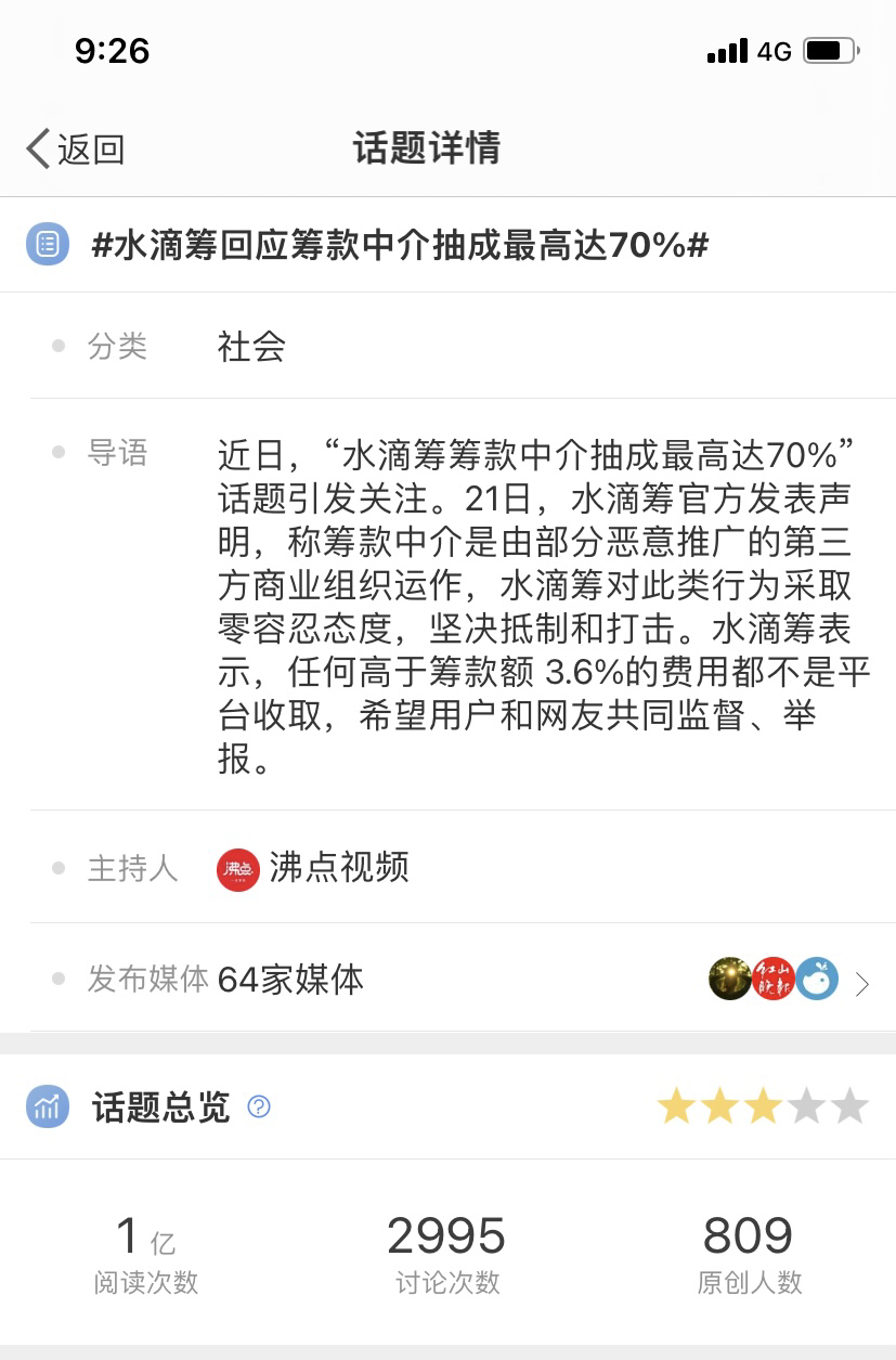另一方面,水滴筹表示,五年多来持续为大病患者补贴平台运营成本,平台也因此承受较大的运营压力。为此,水滴筹从4月7日起试运行向单个筹款项目收取提现金额3%的平台服务费,且单个筹款项目最高不超过5000元。