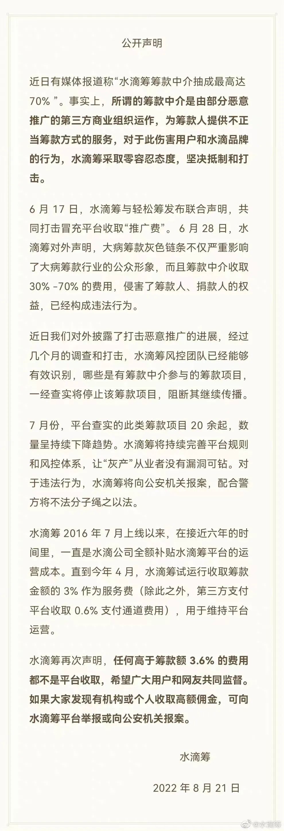 8月21日,“水滴筹筹款中介抽成最高达70%”的话题再次登上热搜,随着事件热度持续升温,水滴筹再次发布声明称,所谓的筹款中介是由部分恶意推广的第三方商业组织运作,为筹款人提供不正当筹款方式的服务。