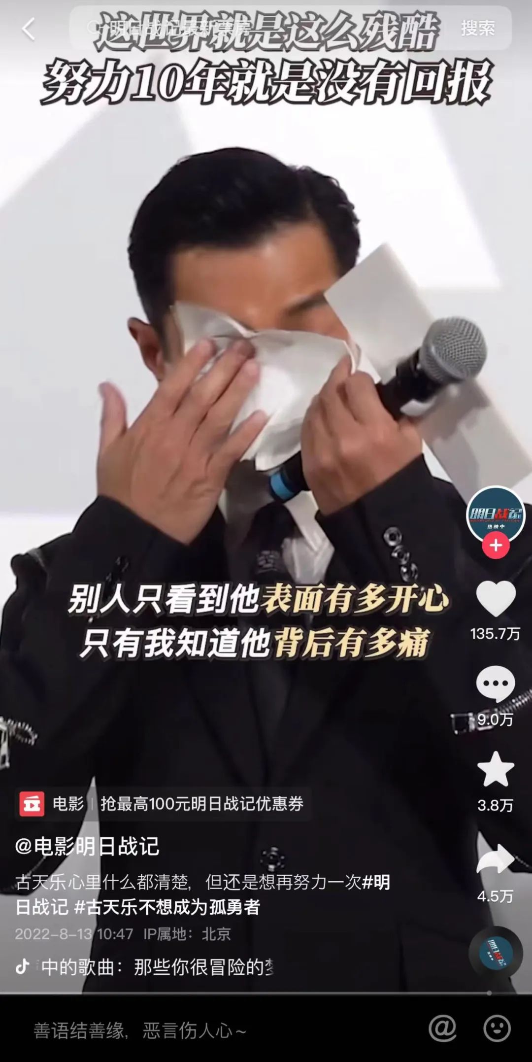 一则于8月13日发布的短视频物料里,打出了“这世界就是这么残酷 努力10年就是没有回报”的字幕,配上路演过程中古天乐掩面擦泪的场景和“古天乐心里什么都清楚,但还是想再努力一次”的文案。