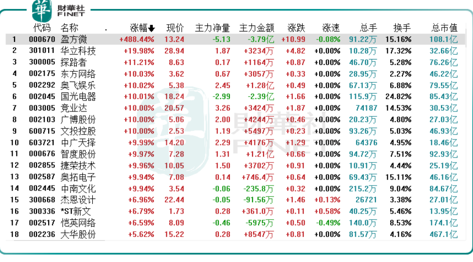 8月22日,虚拟现实板块冲高大涨,概念股掀涨停潮!个股中,华立科技(301011.SZ)、东方网络(002175.SZ)、奥飞娱乐(002292.SZ)、国光电器(002045.SZ)、竞业达(003005.SZ)等10逾只个股涨停,罗曼股份(605289.SH)、大华股份(002236.SZ)等纷纷跟涨。此外,今日复牌的盈方微(000670.SZ)亦大涨超4倍。