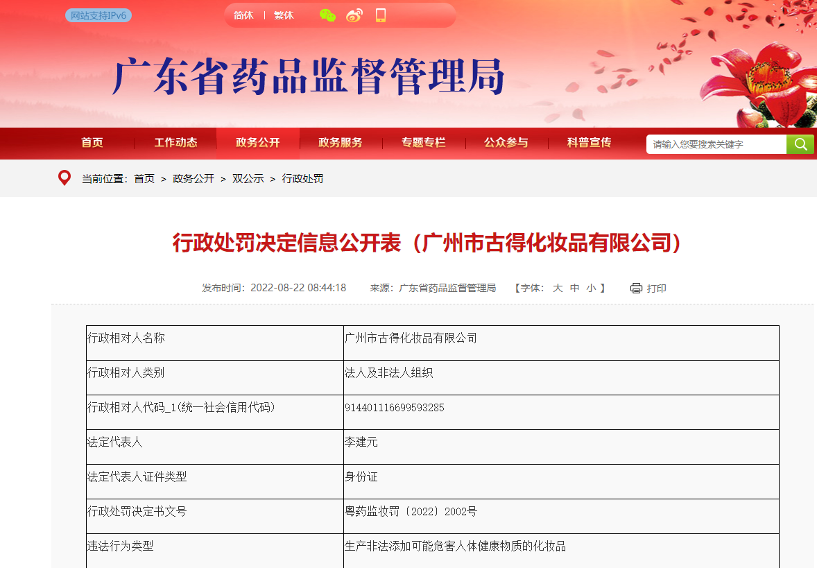 8月22日,广东省药品监督管理局发布一则行政处罚信息,广州市古得化妆品有限公司(下称:广州古得)因在儿童化妆品中添加禁用物,被罚没12万元,公司被禁业10年,法定代表人被终身禁业并罚款。