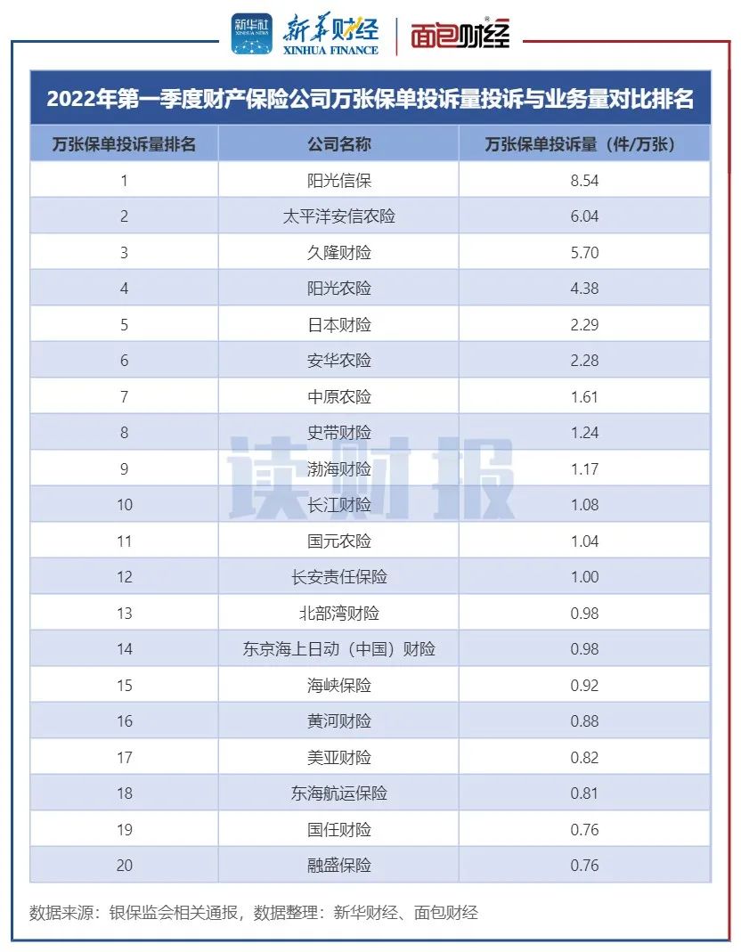 从万张保单投诉量来看,2022年第一季度,阳光信保、太平洋安信农险以及久隆财险位居财产保险公司的前三位。其中,阳光信保不仅位居亿元保费投诉量首位,其投诉量也在万张保单投诉量排第一,为8.54件/万张。