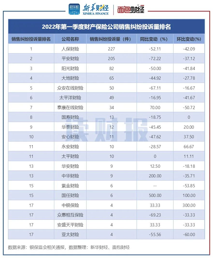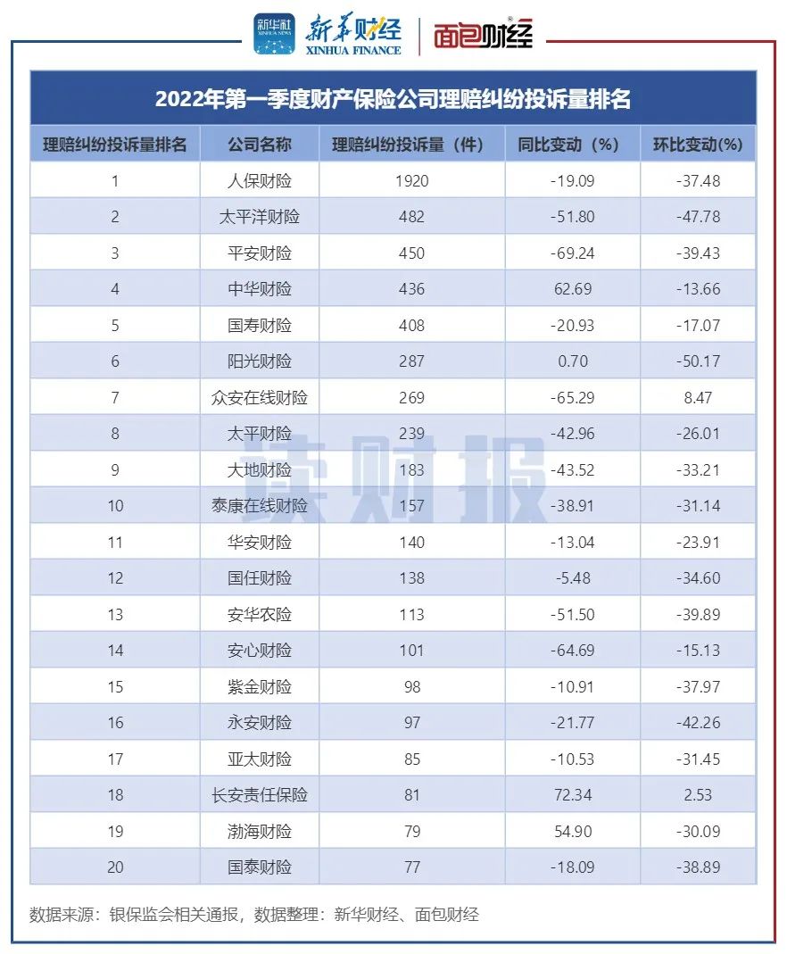 从2022年第一季度的环比增速来看,2022年第一季度财险投诉量排名前20的公司均下降,其中,阳光财险降幅最大,达49.23%。