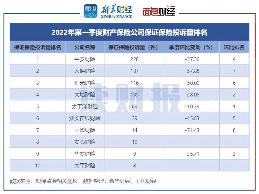 较去年四季度相比,2022年第一季度保证保险纠纷投诉量排名前10的财险的可比公司环比变动均下降,其中,中华财险第一季度保证保险纠纷量环比降幅最大,达71.43%。