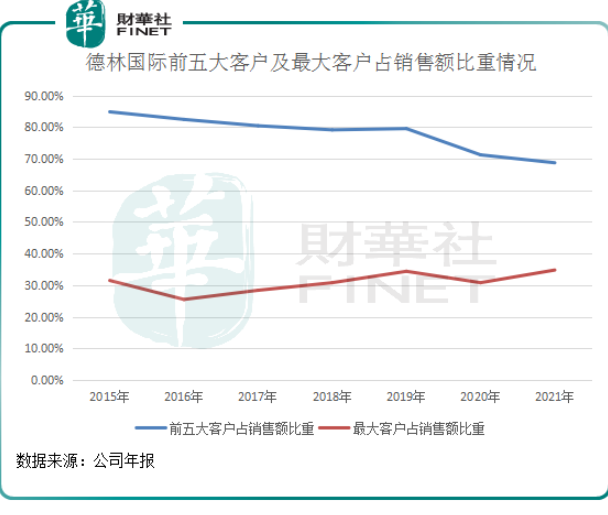 过去数年来,尽管德林国际不断尝试开拓新客户,前五大客户占销售额比重有所下滑,但在2021年该比重依然接近70%,还未摆脱对大客户的依赖症。此外,公司来自最大客户的销售额比重也常年高于30%。