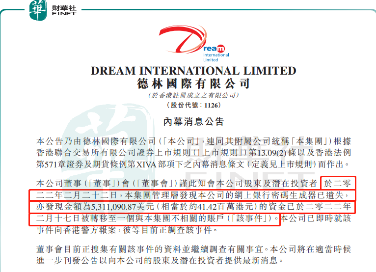 今年2月,德林国际突然发布公告称,管理层发现公司的网上银行密码生成器已遗失,亦发现金额约为531.11万美元的资金已于2022年2月17日被转移至一个与集团不相关的账户。