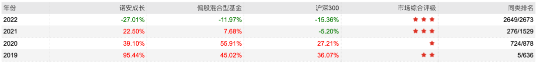 2019年、2020年、2021年,诺安积极回报A的全年收益率分别为29.95%、40.80%、4.35%,同期灵活配置型基金平均收益率为29.73%、39.80%、10.26%。
