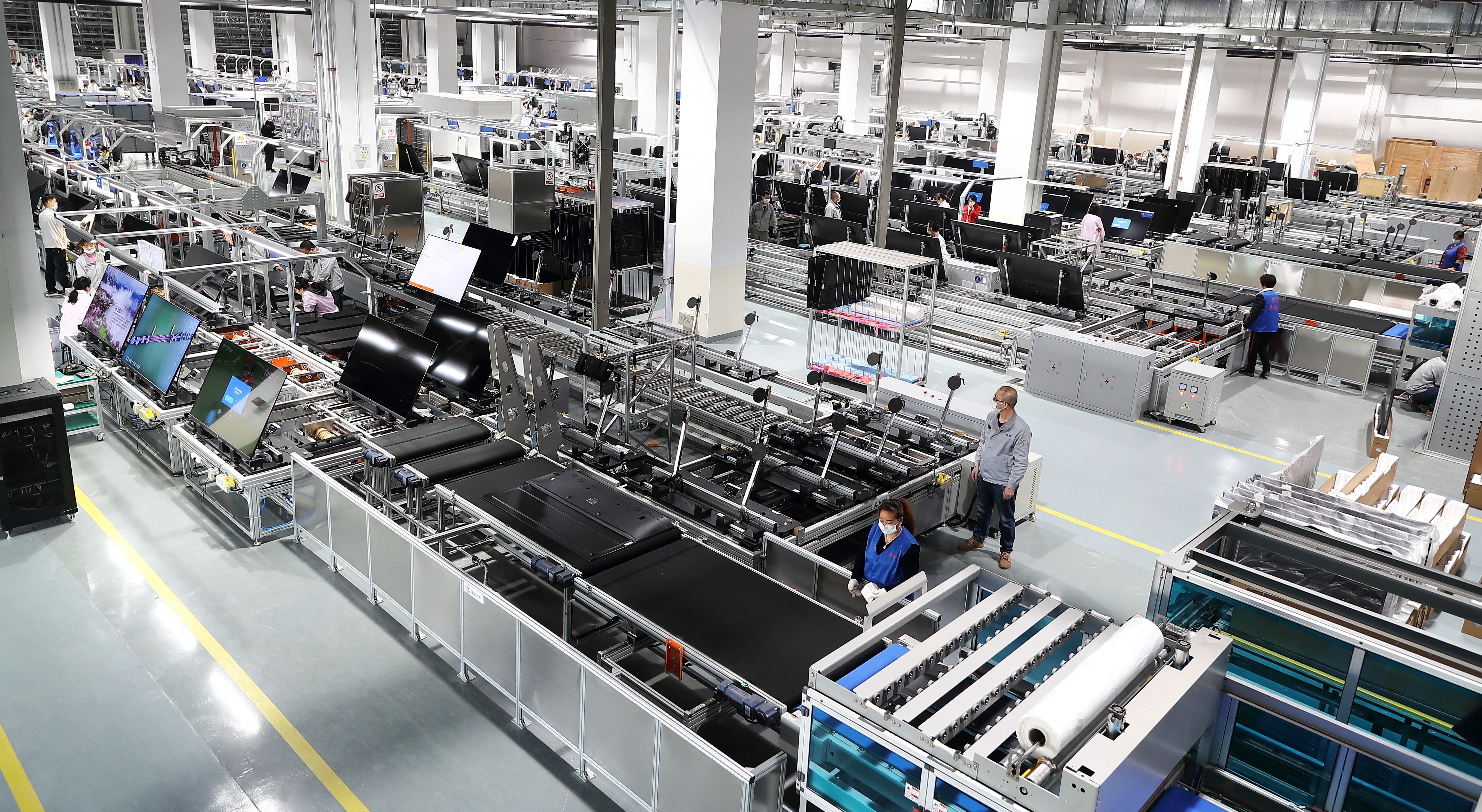 “5G+工业互联网”生产线属国内首条,也是中国最先进的智能电视大规模定制生产线。作为智能电视的数字化生产线,其具有高度自动化、信息化、智能化等特点,在国内处于领先地位,其整个工厂的物流自动化率达到了95%。而且通过以用户为导向的信息化建设,无人工厂和大数据的及早布局使大规模个性化定制成为可能。