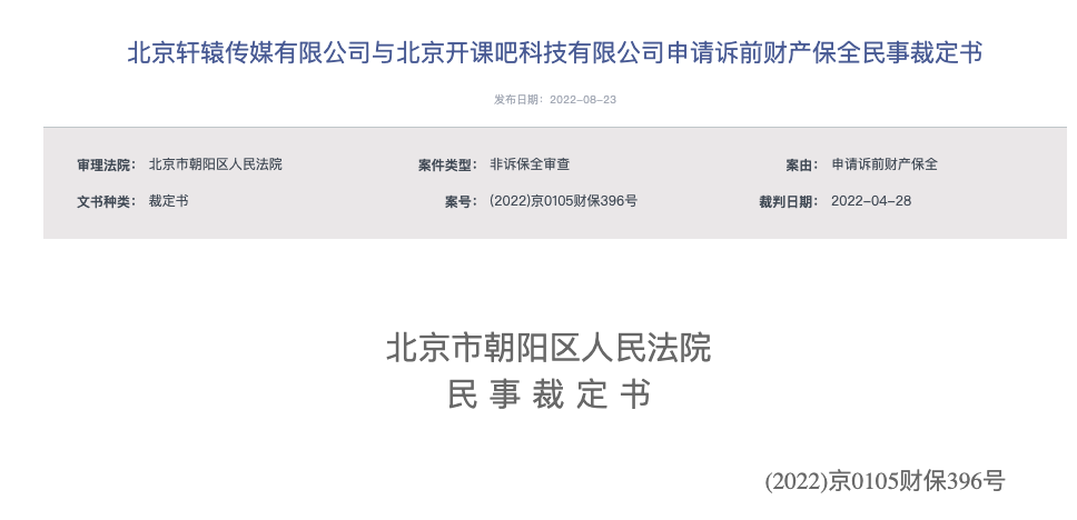 8月23日,北京法院审判信息网公布北京轩辕传媒有限公司与北京开课吧科技有限公司申请诉前财产保全民事裁定书,审理法院为北京市朝阳区人民法院。裁定书显示,申请人北京轩辕传媒有限公司于2022年4月20日向法院申请财产保全,请求对被申请人名下价值200万元的财产采取保全措施。经审查,法院裁定查封、冻结、扣押被申请人北京开课吧科技有限公司名下价值200万元的财产。