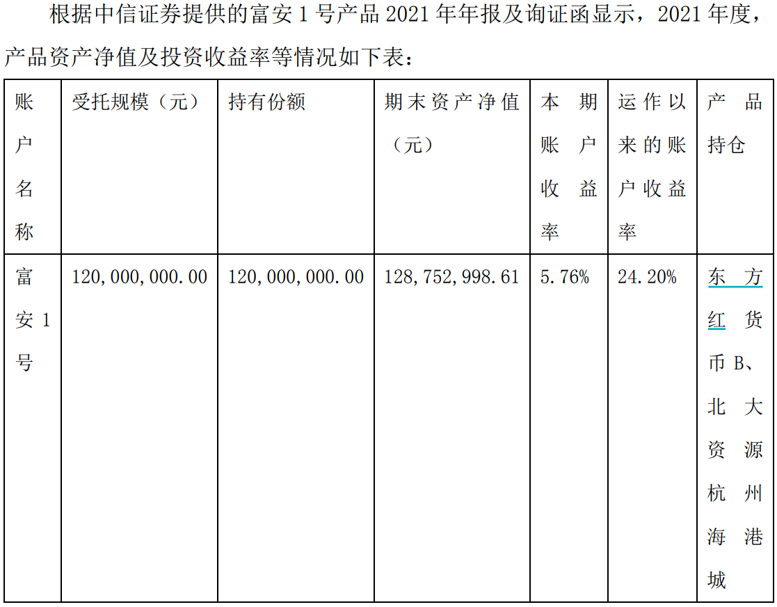 根据中信证券提供的富安1号产品2021年年报及询证函显示,2021年度,富安1号受托规模1.2亿元,本期账户收益率5.76%,运作以来的账户收益率24.20%。