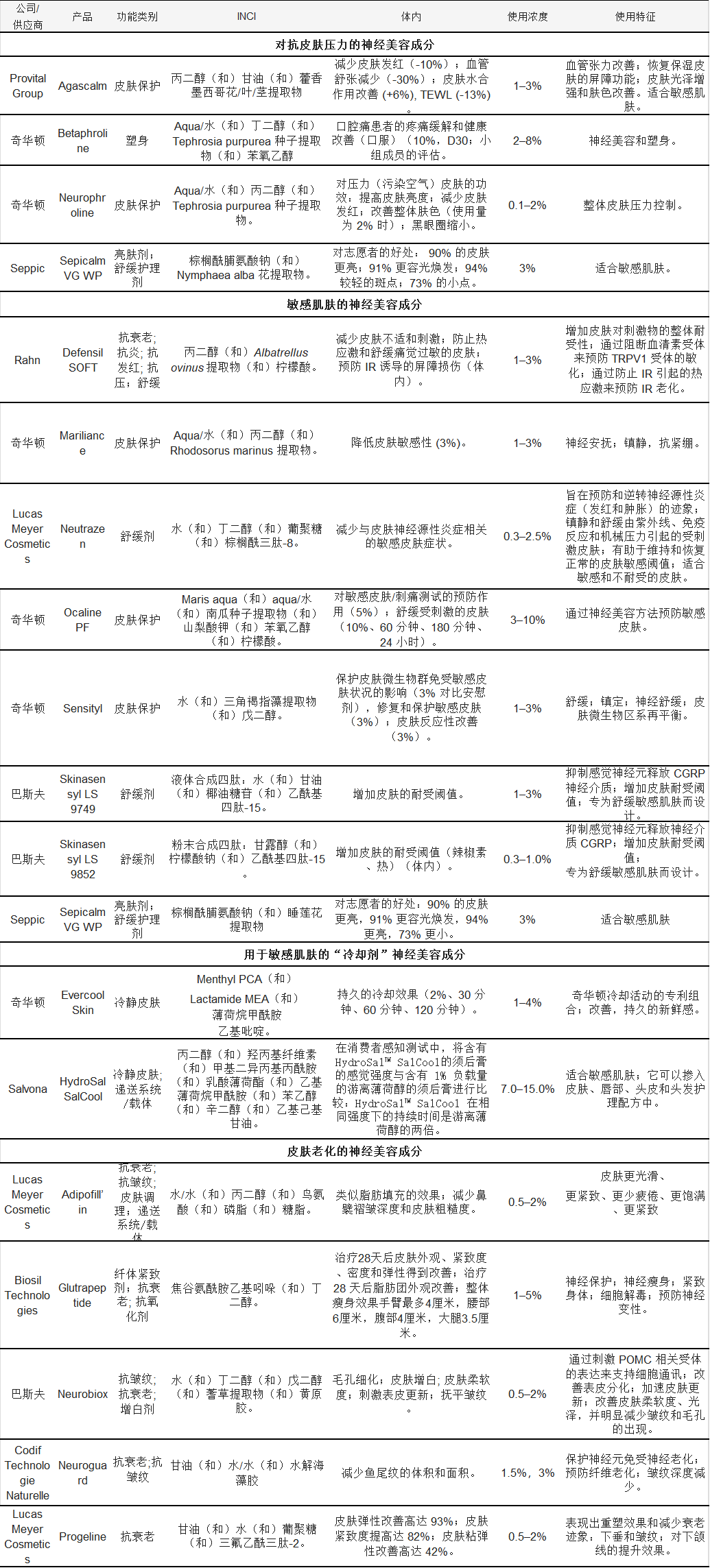 2021年发表在国际化妆品研发期刊 Cosmetics上的一篇文章对“神经化妆品”进行了介绍,这篇文章例举了市面上四类主要的神经美容成分:用于对抗皮肤压力、用于敏感皮肤护理、用于敏感皮肤的清凉剂、用于对抗皮肤衰老。