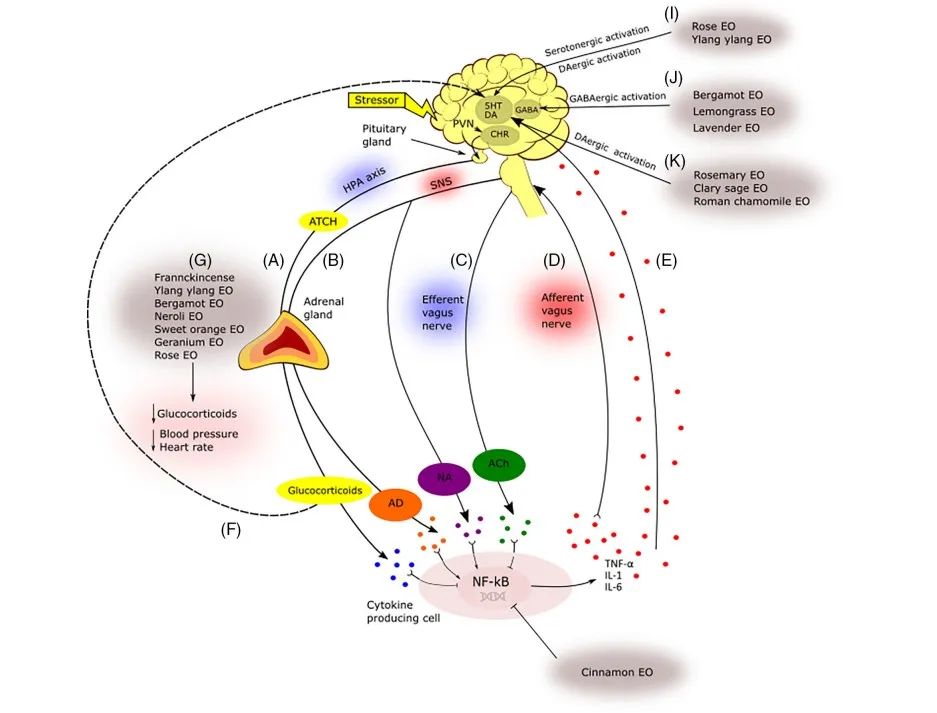 2020年,英国普利茅斯大学的一篇论文中研究了依兰、柠檬草、广藿香、罗马洋甘菊、大马士革玫瑰等植物精油对中枢神经系统的影响。临床试验表明,使用这些植物精油能够触发不同的神经通路,并引发一系列生理和心理反应,例如带来放松、满足的感受。