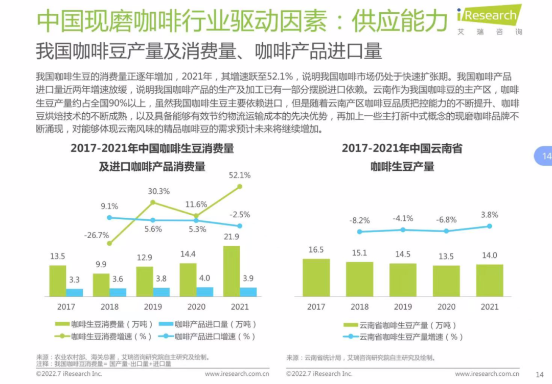 从咖啡豆供应端,我国咖啡豆产量增速已达52.1%,其中主产区云南的咖啡豆产量占比全国的90%以上。本地咖啡豆产量增加,从原料供应上为咖啡企业提供了便利。