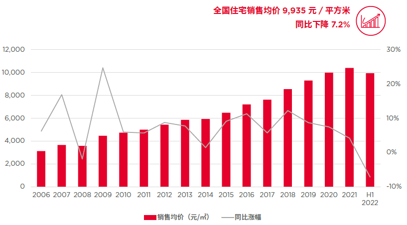 2022年上半年,全国住宅新房成交均价为9,935元/平方米,同比下降7.2%,降幅较一季度收窄1.4个百分点。单二季度住宅新房销售均价9,955元/平方米,与一季度9,912元/平方米均价环比上涨0.4%,全国住宅新房价格总体呈筑底企稳趋势。预计后续政策环境将着力维护市场的稳定发展而进一步改善,从而令市场信心逐步恢复,有利于住宅价格的总体稳定。