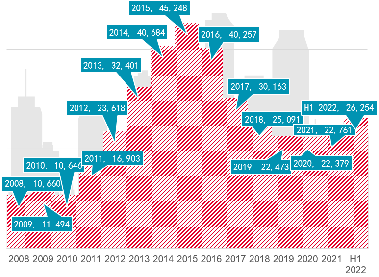 截至2022年上半年,全国新房住宅待售面积26,254万平方米,同比增长13.5%,较一季度降低1,311万平方米。