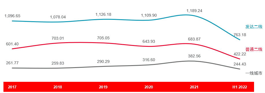 从24个重点城市的成交量来看,上半年住宅新房成交面积同比下降48.2%。其中,一线、发达二线及普通二线城市的新房成交面积同比分别下降36.7%、51.3%、47.6%,重点城市新房市场需求收缩明显。跟过去5年月均成交相比,上半年新房月均成交面积有较大差距,可见市场仍存在较大的修复空间。