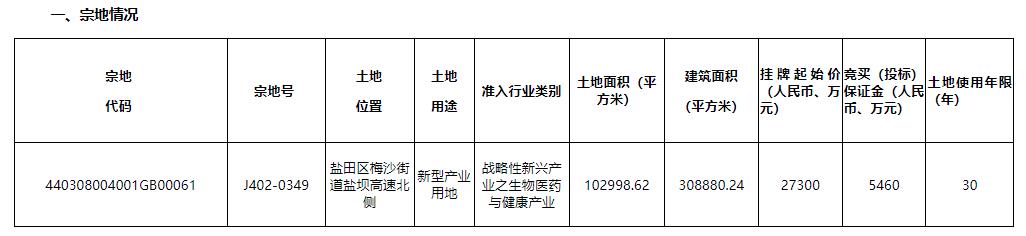 宗地号J402-0349,土地位置盐田区梅沙街道盐坝高速北侧,土地用途新型产业用地,准入行业类别战略性新兴产业之生物医药与健康产业,土地面积10.3万平方米,建筑面积30.89万平方米,挂牌起始价27300万元,土地使用年限30年。