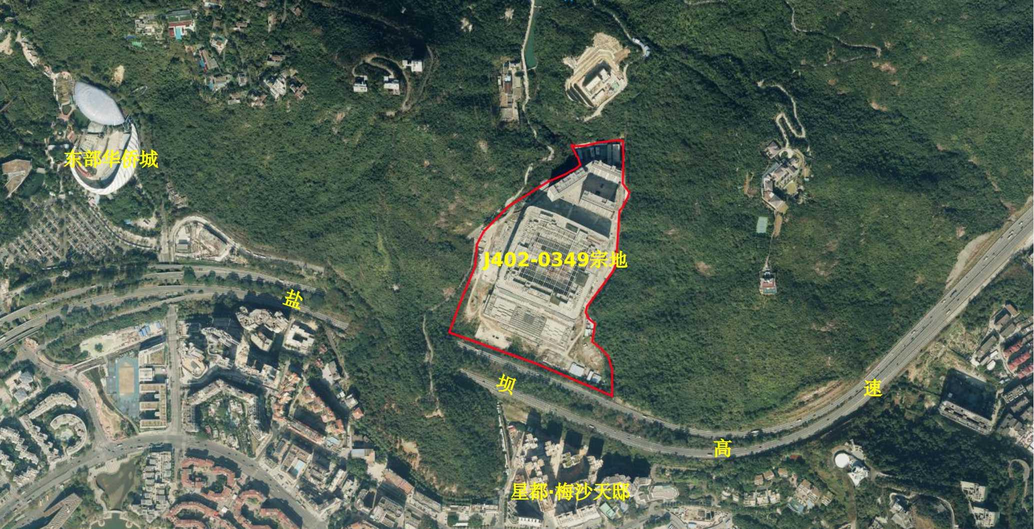 该宗地临近盐坝高速,高速对面是星都梅沙天邸,周边有东部华侨城。