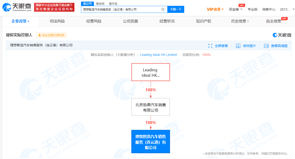 天眼查App显示,8月22日,理想智造汽车销售服务(连云港)有限公司成立,注册资本1000万元人民币,法定代表人为聂茂林,经营范围含新能源汽车整车销售;汽车销售;汽车零配件零售;二手车经纪;小微型客车租赁经营服务;集中式快速充电站等。该公司由Leading Ideal HK Limited间接全资持股。