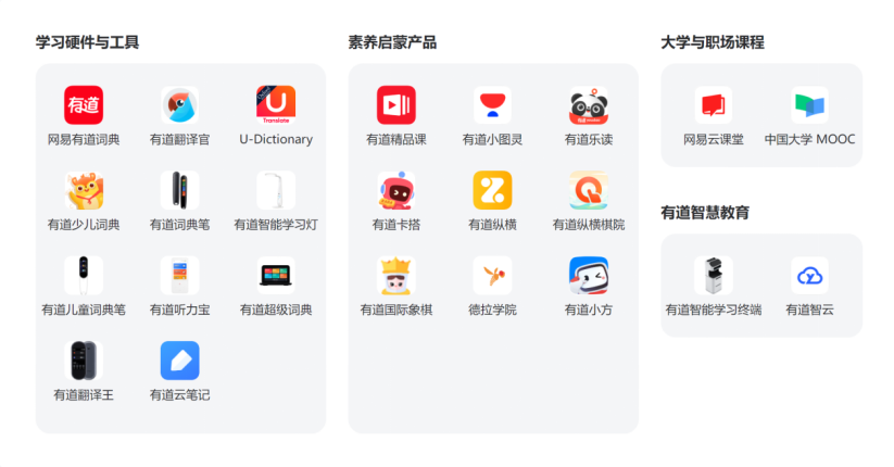 目前,网易有道官网显示,全部产品分为学习硬件与工具、素养启蒙产品、大学与职场课程三大类。