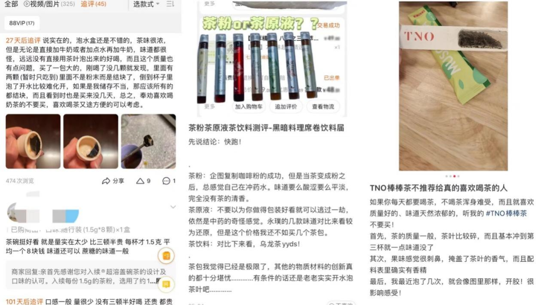 在小红书上,就有网友在购买了多品牌的速溶茶粉和茶原液后总结道,“茶粉试图复制咖啡粉的成功,但是当茶变成粉之后,总感觉自己在冲药水,味道要么酸涩要么平淡,完全没有茶的清香;茶原液,不要以为你做得包装好看就可以逃过一劫,永璞的几款味道对比下来较为还原,但这个价格我不如买几个茶包。”也有网友表示“三顿半和茶颜悦色的联名茶粉,单拿来泡水喝会怀疑人生,上好的茶叶不喝,跑去喝冻干茶粉。”