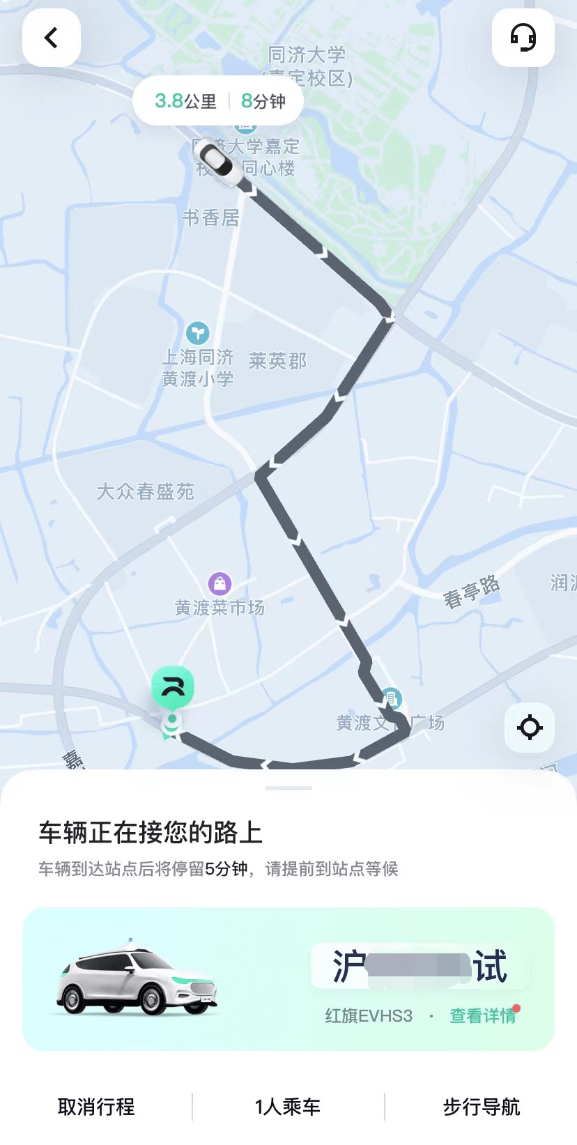8月17日下午,《IT时报》记者来到嘉定区博园路新黄路公交站,在“萝卜快跑”(百度的自动驾驶出行服务平台)上预约了一辆Robotaxi。一分钟不到,平台显示,接单车辆正从2公里外驶来,预计用时10分钟。