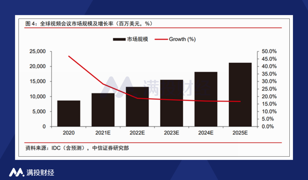 虽说2020年的新冠疫情让视频会议行业一时间成为了风口,但办公模式的云端化、在线化却并非只是昙花一现。随着疫情得到有效控制,线下办公逐步恢复,尽管线上会议的需求大不如前,但它的便利性和高效性却也为这一市场留足了空间,混合办公模式逐渐成为部分企业的选择。根据IDC预测,2021年全球视频会议市场规模为111.1亿美元,2025年将达到212.1亿美元,2021-2025年复合增速为17.5%。