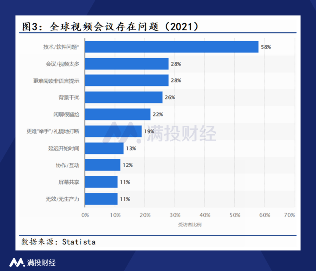 不过,作为疫情催生出的行业龙头,Zoom也有其独有的竞争优势。据Statista调查,有58%的受访者认为视频会议的最大问题在于网络稳定性等技术性故障,而凭借在全球布局的数据中心节点,Zoom提供的视频会议服务具有较高的可靠性和稳定性,通话质量也相对较高,因此成为多数企业和机构的首选,且拥有较高的用户粘性。