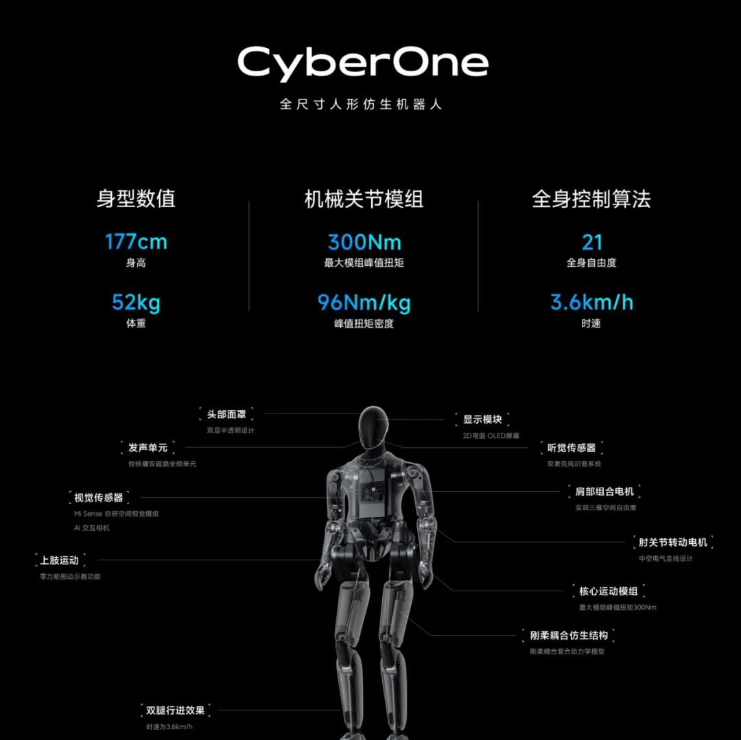 按照雷军在发布会上的说法,Cyber One由小米机器人实验室全栈自研完成,除了能实现双足运动姿态平衡外,四肢强健、动力峰值扭矩300Nm等四大技术能力外,还可感知人类情绪;对真实世界三维虚拟重建。
