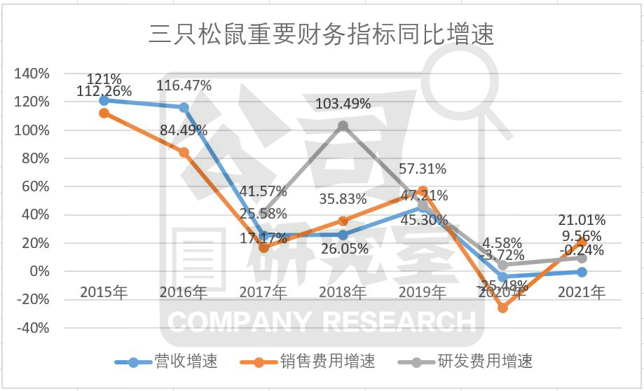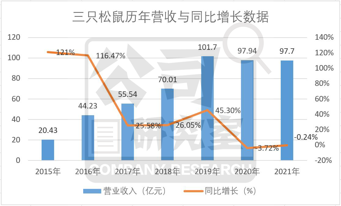 一位圈内人对公司研究室坦言,“10年红利期,已经不短,三只松鼠的原始积累已经完成,而且公开上市,应该知足了。只是对于那些深套在公司股票中的中小投资者而言,幻想着依靠营收短期高速增长来解套已经不现实了。事实上,从2017年起,公司营收就稳定在25% 附近,2019年脉冲到45%,随后两年因为疫情一下子跌入负数。因此,三只松鼠依靠流量带来的单纯数量型扩张,其实早已走到末路。只是不少人还沉迷在它以往的网红光环里,不愿意或不敢承认而已。”
