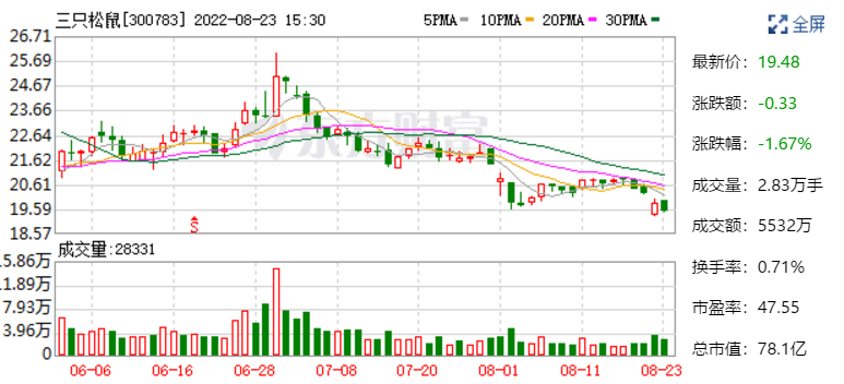 消息发布后,投资者用脚投票,导致股票开盘大跌。截至8月23日收盘,三只松鼠的股价只及高点时的21.44%,难怪有股民称“三只松鼠跌得只剩半只”。不少人质疑,这家最初靠5个人在淘宝网上卖货起家的食品公司,曾经红极一时,眼下是否已经过气?